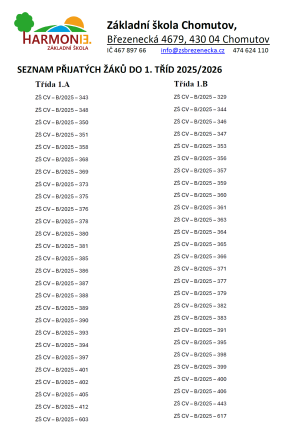 Seznam přijatých žáků do 1. ročníků 2025/2026